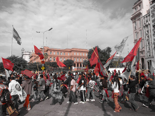 En esta jornada de reafirmación de los derechos del trabajador en todo el mundo, los descamisados del presente, cartoneros, manteros, artesanos, feriantes, vendedores ambulantes, costureros, motoqueros, campesinos, obreros de fábricas y empresas recuperadas, ladrilleros, trabajadores de infraestructura social, trabajadores de programas sociales y de otros tantos sectores castigados por la informalidad y la precarización laboral, nos damos cita en el Ministerio de Trabajo para marchar hacia el Monumento al Trabajador.